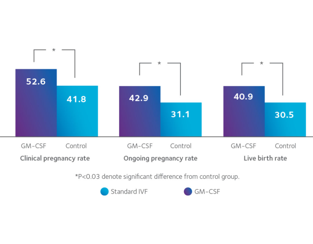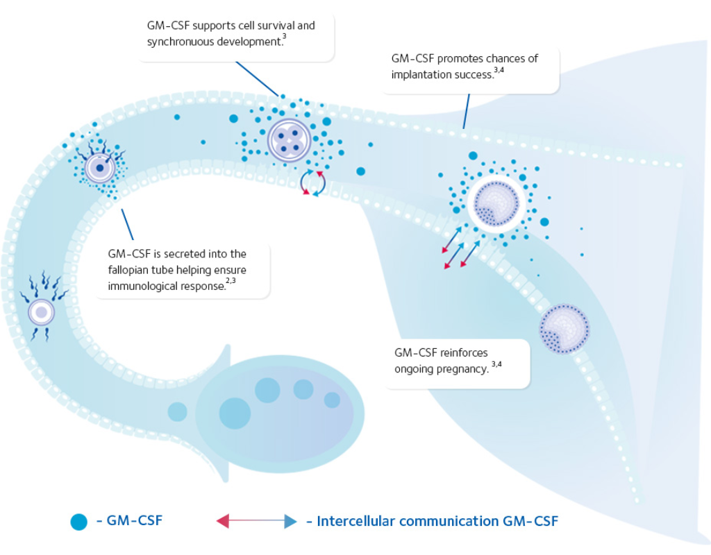GM-CSF is an important protein that supports communication between the embryo and the endometrium, enhances implantation potential, and reduces embryo cell death (apoptosis).